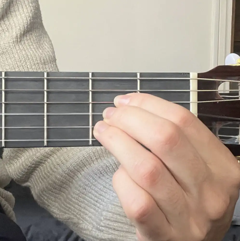 - Un seul doigt (index) qui barre légèrement les cordes Ré, Sol et Si en 2e case.